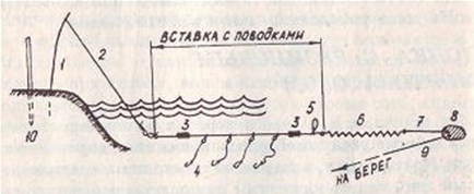 Эта снасть позволяет, один раз забросив, на протяжении всей рыбалки заменять приманку и снимать рыбу с крючка, не вынимая грузила из реки, озера. А вся суть идеи — в авиамодельной резинке, отрезок которой вставлен между грузилом и леской. При выбирании из водоема лески резинка растягивается, а при отпуске — сокращается, увлекая леску под воду. Наживка, таким образом, всякий раз ложится на одно и то же место, что в немалой степени способствует успеху ловли. Компоненты донки: удильник (или просто прутик), колышек, рабочая леска 0,4–0,5 мм. оканчивающаяся большой петлей, вставка длиной 2–3 м из лески 0,30 — 0,35 мм. к которой крепятся 3–4 поводка с крючками, резинка, грузило (рис. 1). Толщину поводков и размер крючков подбирают в зависимости от вида рыбы, за которой намерены охотиться. Поводки прикрепляются к вставке петля в петлю или с помощью застежек. Рис. 1. Снасть с резинкой: 1 — сторожок; 2 — леска; 3 — свинцовые грузики; 4 — поводок; 5 — петля для фиксации на берегу; 6 — резинка; 7 — леска; 8 — грузило; 9 — леска (шнур) для заброса и вытаскивания снасти; 10 — колышек для фиксации Донка может быть любой длины, неизменным остается соотношение лески и резинки: примерно 5:1, то есть на каждые 5 м лески требуется 1 м резинки. Грузило подбирают такое, чтобы оно не двигалось с места в процессе ловли. Его обычно заводят на лодке в нужную точку и с буйком опускают на дно. После окончания ловли подплывают к буйку, поднимают грузило и собирают снасть. Без лодки проблему решают по-другому: к грузу привязывают толстую леску и после заброса отводят ее в сторону, прикрепив к чему-нибудь на берегу. Вечером с помощью этой лески вынимают грузило из водоема. Грузило удобнее специальное, с рожками, которые прочно удерживают его на дне (рис. 2). После потяжки за буксирную леску грузило разворачивается и легко скользит к берегу.