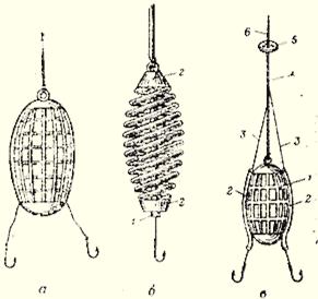 Рис. 1. Устройство донки: а — ходовая донка: б — удильник для донки: 1 — удильник, 2 — мотовильце; 3 — наконечник; 4 — резинка; в — груз: 1 — неподвижный; 2 — скользящий Леса для донки применяется более прочная, чем для поплавочной удочки. Важно, чтобы она не рвалась при забросе донки с тяжелым грузом. Наиболее распространены лесы 0,3–0,5. Груз для донок отливается из свинца самой различной формы, удобной для ловли при любом состоянии дна водоема. Груз (рис. 1, в) может скользить по лесе выше поводков или быть закрепленным наглухо на конце лесы ниже поводков. В настоящее время рыболовы заменяют груз грузом-кормушкой, с помощью которого на расстоянии забрасывается не только насадка, но и прикормка. Практика показывает, что уловистость такой донки при ловле «мирных» рыб значительно выше, чем донки с обычным грузом. Форма груза-кормушки (рис. 2) может быть различной, однако он должен быть достаточно тяжелым, чтобы можно было делать дальние забросы и хорошо прикармливать рыбу. Чтобы груз-кормушка при забросах не рвал лесу, рыболовы делают специальную снасточку с грузом-кормушкой (рис. 2, в), с капроновым шнуром и ограничителем для удобства заброса. При таком оснащении донки основную лесу можно ставить тонкую, но чтобы она выдерживала рыбу, которую предстоит ловить на данном водоеме. К лесе или кормушке привязываются поводки с крючками из тонкой и прочной лесы. Около удильника на лесе крепится колокольчик или свинцовая пластинка, сигнализирующая о поклевке рыбы (рис. 3). Крепятся они по усмотрению рыболова на разном расстоянии.