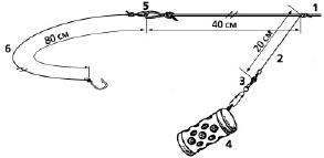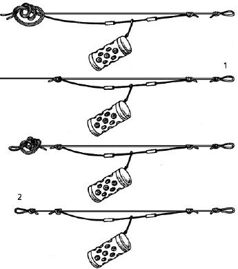 Рис. 3. Оснастка с закрытой кормушкой: 1 – основная леска; 2 – поводок для кормушки;