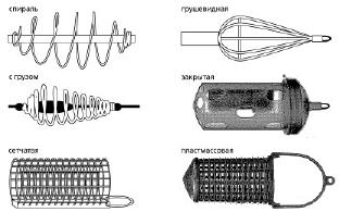 По форме кормушки бывают спиралевидные (с огрузкой и без нее), цилиндрические,