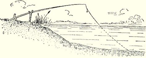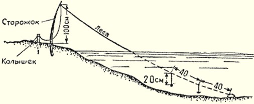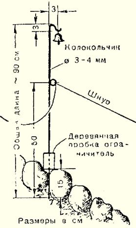 Рис. 3. Перед забросом насадки шнур уложите змейкой на берегу, рабочий конец возьмите правой рукой несколько выше поводков, раскачайте и с силой (но осторожно, чтобы не сорвать насадку) забросьте как можно дальше от берега. Как только груз достигнет дна (что замечается по внезапному ослаблению шнура), слегка натяните шнур и подвяжите его к сторожку несколько ниже его вершинки. Свободный конец шнура прикрепите к забитому рядом со сторожком колышку, ветке дерева и т. п., чтобы в случае поклевки крупной рыбы она не утащила снасть в воду. Поклевка рыбы сигнализируется колебаниями сторожка или выпрямлением лески. Для ловли с каменистых берегов, наклонных набережных, одетых камнем, пристаней, пирсов, плотов и тому подобных мест удобен металлический сторожок, изготовленный из стальной проволоки диаметром 5–6 мм с заостренным концом, кольцеобразным изгибом для крепления лески, верхним крючком для подвески колокольчика и деревянным ограничителем, надетым на заостренную часть сторожка (рис. 4).