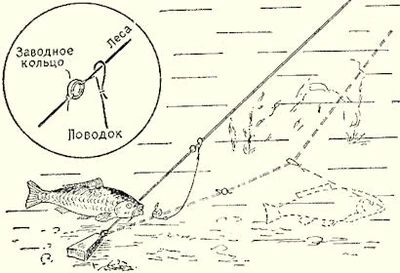 Рис. 5. После заброса насадка несколько подтягивается к лодке. Чаканка одним концом закрепляется на борту лодки таким образом, чтобы конец удильника висел над водой, а леска была натянута небольшим грузиком, подвешенным к ней около вершинки чаканки. Поклевка рыбы обнаруживается по вздрагиванию и натяжению лески. Чаканка применяется также и для ловли судака. Сом ловится донными удочками только в самое теплое время года (июль — август). Ловить его следует в глубоких ямах около крутых берегов (где замедляется течение), в глубоких омутах ниже мельниц, плотин, перекатов. Лучший клев сома наблюдается в первой половине ночи и на рассвете. Однако мелкие сомята хорошо ловятся в течение двух-трех часов после восхода солнца и вечером — за два часа до сумерек. Донными удочками обычно ловят относительно некрупных сомов, весом до 8–12 кг. Удочка оснащается прочной леской диаметром 0,7–0,8 мм. Груз весом 20–40 г прикрепляется на конце шнура (скользящий — в 50–60 см от конца шнура). В зависимости от величины насадки крючки подвязываются крупные, пружинящие — от № 14 до № 30; при ловле на рыбку, раковую шейку, лягушонка, мясо ракушки ставятся двойные (двухподдевные) крючки № 8,5 —№ 12. Удочка, кроме того, оснащается колокольчиком или катушкой с тормозом-трещоткой. Удилище при ловле укладывается на рогульки, а нижний конец его привязывается к какому-нибудь предмету на берегу. На Средней Волге сомов ловят в глубоких ямах заливных озер на удочки, оснащенные двумя-тремя крючками (№ 14—№ 18 с длинным цевьем) на отдельных поводках. На крючки насаживают кусочки фетра или войлока (с обожженной шерстью) размером 1,5х1,5х2 см таким образом, чтобы остро отточенное жало крючка было снаружи. Такую насадку сом берет жадно и наверняка. За два дня до ловли на избранном месте опускают приваду: кусок мяса или птицу, опаленные на костре. Сильный аромат жженой роговицы привлекает сомов. Обнаружив приваду, они не отходят от нее вплоть до самой ловли. Чтобы сомы не утащили приваду, ее завертывают в рогожу или в мелкоячеистую сетку, привязывают к тяжелому камню и опускают на дно. В Сыр-Дарье и Аму-Дарье сом успешно ловится на медведку. Днепровские рыболовы насаживают на крючок несколько медведок вперемежку с желтыми лепестками подсолнуха. Для ловли сома в Десне, южнее Чернигова, лучшей насадкой считается крупная пиявка. Судак ловится донными удочками в реках около крутых, обрывистых берегов со «сбойным» течением, где сильная струя воды срывается с мыса в сторону противоположного берега, а ниже этого места образуется омут со слабым обратным течением у берега. Насадка (пескарик, вьюн, щиповка, небольшой голавлик и другие рыбки с узким и продолговатым тельцем) забрасывается на расстояние 10–20 метров от берега таким образом, чтобы она находилась на грани прямого (быстрого) течения и обратного (слабого). Рыбка насаживается на крючок за спинку ближе к голове с таким расчетом, чтобы ее не сломало сильным течением. На Немане, в Днепро-Бугском лимане судака ловят на кусочки рыбы. Лучшее время ловли — спустя две недели после нереста (примерно с третьей декады июня) и до ледостава. Наиболее активный клев судака наблюдается: в летние месяцы — на зорях, а на глубоких местах — и днем; осенью судак хорошо ловится днем. Удочка оснащается леской диаметром около 0,5 мм; крючки — одинарные от № 8,5 до № 12 (л