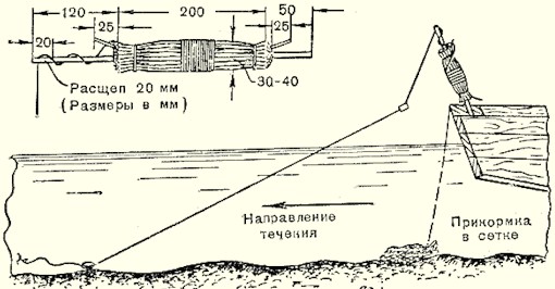 Рис. 4. На донные удочки можно ловить с приманкой. Привяжите к грузику небольшой мешочек из гардинного тюля с измельченным подсолнечным (льняным) жмыхом, сухарями, пропитанными растительным маслом, и тому подобным кормом для рыб. Опыт ловли на Волге показывает, что с такой приманкой рыба ловится значительно лучше. Белоглазка ловится донными удочками лишь случайно, с июня и до самой поздней осени, особенно если насадкой являются навозные черви и мясо речных ракушек. Вырезуб ловится в лиманах Черного и Азовского морей, в нижнем и среднем течении больших рек этих бассейнов. Более всего удобна для ловли вырезуба донная удочка, которую устанавливают на самых глубоких и быстрых местах и в водоворотах у крутых и обрывистых берегов. «Донка» оснащается поводками диаметром 0,35–0,5 мм с одинарными бронзированными или оксидированными крючками № 5 — № 8,5 (№ 5–0,5х16; № 6–0,6х16; № 7–0,7х18; № 8,5–0,8х18). На крючки насаживают мясо ракушки-перловицы, раковую шейку, дождевых червей, мочку навозных червей. Вырезуб ловится с вечера и до утра. Насадку он берет верно. На леске ведет себя бурно, оказывая упорное сопротивление при вываживании. При ловле этой рыбы соблюдайте тишину: вырезуб очень пуглив. Голавля можно успешно ловить донными удочками с апреля, когда вода начинает светлеть после весеннего половодья. Во второй половине лета голавлей можно ловить с насадкой раковой шейки, маленького лягушонка, крупных личинок, жуков (навозного или майского), шариков из черного хлеба, сдобренных растительным маслом. По мере похолодания воды, начиная с первых чисел августа, а иногда — с последних чисел июля, голавли отлично ловятся донными удочками в тихих и глубоких местах рек с каменистым или с песчано-каменистым дном. Клев обычно начинается перед рассветом, к средине дня ослабевает и возобновляется к вечеру, продолжаясь почти до полуночи. Лучшими насадками в это время являются шарики из черного хлеба, каша, личинки жука-носорога, мальки (пескарики). Ловля голавля донными удочками протекает более успешно с привадой, в качестве которой можно применять хлеб, уложенный в сетку, конопляный или льняной жмых, измельченные на мелкие кусочки, мелко нарезанные бараньи или куриные кишки, кусочки внутреннего сала (их же можно использовать и в качестве насадки). Густера успешно ловится донными удочками в течение, всего лета, в утренние и вечерние часы. Ловить лучше всего под плотами, в глинистых ямах у обрывистых берегов и на глубоких плесах с замедленным течением. На затененных участках рек днем ловится некрупная густера. На крючки насаживается мелкий земляной или навозный червь. Ерш очень часто попадается на, донные удочки при ловле другой рыбы, если при этом крючки наживлены мелкими червями. Леща ловят донными и закидными удочками преимущественно ночью и ранним утром в то же время года и на те же насадки, что и поплавочными удочками. При ночной ловле леща некоторые московские рыболовы применяют беспоплавочную донную удочку с длинным бамбуковым удилищем, имеющим тонкую вершинку. Такая удочка оснащается леской диаметром 0,35 мм, скользящим грузилом и крючком № 8,5–0,9х22, на который насаживаются два-три выползка. После заброса на всю длину лески рыболов держит удилище, слегка натянув леску. При поклевке леща рука чувствует легкую потяжку, которую можно сравнить с посадкой на 