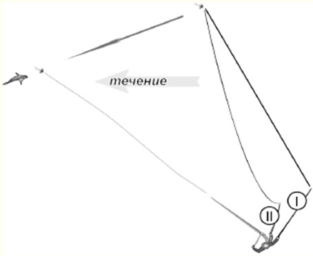 Рис. 3. Второй вариант проводки мокрой мушки При этом у нас остается контакт только со шнуром. Свисающая с удилища часть шнура образует большую свободную дугу (рис. 3, II), которая ни в коем случае не должна уменьшаться под воздействием течения в процессе проводки, иначе все ваши усилия напрасны и мухи будут перемещаться не в соответствии с течением. Вес шнура при такой проводке способствует тому, что рыба засекается сама, следовательно, чем тяжелее класс снасти по AFTMA, тем проще будет ловля. В последней фазе проводки, когда муха или мухи, если их две, уже находятся ниже нас по течению, левой рукой медленно начинаем подтягивать шнур, одновременно поднимая удилище. Активно поднимающиеся мухи весьма соблазнительны для многих рыб, особенно крупных. Однако подтягивать шнур надо осторожно, чтобы не уменьшать дуги его провисания. Эти подтягивания бывают очень результативными при ловле с тонущим подлеском или шнуром с тонущим концом (F/S Line). На самом деле и при первом, и при втором вариантах проводки мухи все равно будут перемещаться по небольшой дуге относительно направления течения, но во втором случае это перемещение сплывающих мушек для стоящих ниже по течению рыб будет почти не заметным. Эффективный вариант второго способа – проводка мух на коротком шнуре. Здесь более рационально использовать длинное удилище. Привязываем две мухи. Нижняя достаточно большая (Muddler, крупный пальмер) необходима для того, чтобы усилить сопротивление снасти в воде и натянуть ее. Выполняем короткий заброс перед собой и немного выше и проводим мушки на натянутой снасти непосредственно перед удилищем так, чтобы они плыли в соответствии с направлением течения, только чуть медленнее. Подвесная муха при натянутой снасти как будто стремится на поверхность, что не может оставить рыбу равнодушной. Более того, возможен даже вариант, когда сила течения будет настолько велика, что, выталкивая на поверхность нижнюю муху, она «заставит» подвесную подпрыгивать на воде. Труднее всего ловить мокрой мухой, забрасывая снасть вверх против течения. В этом случае постоянно подтягиваем шнур, чтобы сохранить контакт с мухами и ощутить поклевку. Для такого способа ловли необходима мокрая муха с очень мягкими ножками, связанными из перьев курицы, куропатки, совы, которые даже при минимальном напоре воды будут «работать», и тем самым увеличивать привлекательность приманки. Шнуры применяются как плавающие, так и тонущие. Надо отметить, что этот способ ловли работает не для всех рыб. Например, голавль никогда не позволит шнуру проплыть рядом или над собой. Описанный вариант возможен, если заброс произвести точно против направления течения. Если же мы совершим заброс вверх против течения, но не прямо, а под небольшим углом, то напор воды на среднюю часть вытянутого шнура вытолкнет снасть на поверхность (рис. 4, I). А иногда приходится облавливать выбранные участки именно так, иначе к стоящей за укрытием рыбе не подобраться. Чтобы этого не случилось, нужно сразу же после заброса перебросить часть шнура против течения («Мending») (рис. 4, II).