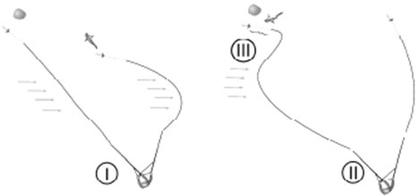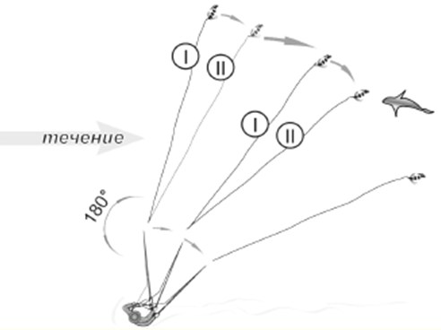 Рис. 2. Первый вариант проводки мокрой мушки Часто в такие моменты рыба не выдерживает и бросается на начинающую всплывать мушку. Поэтому при такой паузе вы должны быть предельно внимательны, ведь после ощущения поклевки (удара) вам необходимо будет моментально поднять удочку вверх, чтобы погасить рывок рыбы удилищем. Это именно тот момент, когда поклевка заканчивается для рыболова неудачно. Поднимая удилище вверх, необходимо одновременно отпускать излишек шнура (с катушки при всех вариантах ловли всегда должен свисать небольшой запас шнура), пропуская его между пальцами левой руки, но сам шнур должен оставаться натянутым. Таким образом, наколовшись, рыба не оборвет муху и не сойдет, так как ее второй, наиболее мощный рывок уже не придется на полностью вытянутую в одну прямую снасть. Его погасит поднятое удилище, а натянутый шнур не позволит рыбе освободиться от мушки. Часты случаи, когда рыба, несмотря на привлекательность мухи, сопровождает ее, но не атакует. Тогда следует попробовать вести муху так, чтобы она перемещалась в полном соответствии с течением, т. е. ничем не выделялась среди естественных дрифтующих организмов. Этот способ ловли лучше применять при визуальном контроле за мушкой, но порой мы просто вынуждены ловить вслепую. Производим заброс с вытягиванием шнура («Reach Cast») (рис. 3, I), удилище после заброса поднимаем вертикально вверх (рис. 3, II) и, постепенно опуская кончик удочки вниз, сопровождаем удилищем движение сплывающего шнура, стараясь, чтобы его натяжение было минимальным. Для того чтобы предупредить преждевременное стягивание мух течением и, таким образом, увеличить дистанцию проводки, можно сразу после заброса произвести перебрасывание части шнура («Mending»), расположив его по дуге против течения. Чтобы еще больше увеличить «естественное» перемещение мухи в соответствии с течением, можно воспользоваться комбинацией «Curve Cast Positive» + «Mending» – заброс с образованием петли + перебрасывание шнура при ловле с левого берега. Если же мы ловим с правого берега, то это будет «Curve Cast Negative» + «Mending» – дуговой заброс + перебрасывание шнура. Здесь опять-таки важно, чтобы шнур хоть и по дуге, но был вытянут, а не лежал змейкой, чему дополнительный маневр «Mending» также будет способствовать.