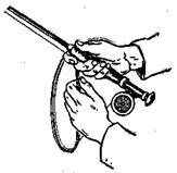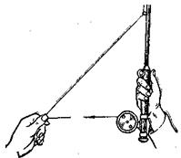 Рис. 8. Оттягивание лески Чтобы укоротить леску, ее собирают кольцами в бухту, как показано на рис. 9, или просто кладут на землю. При забросе вперед вновь отпускают леску или часть ее. Хорошее удилище может подобрать сразу всю бухту из 5–6 петель. Такое быстрое удлинение носит название «стрельбы Леской».