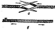 Рис. 5. Сращивание лески: а — разделка концов, б — обмотка места соединения После основательной просушки колена разъединяют, узлы обрезают и делают каждое колено длиной 305 см. Теперь остается соединить колена — и леска почти готова. Перед соединением концы колен расплетают и зачищают острым ножом на 2,5 см в виде кисточки. Соединяют концы, как указано на рис. 5. Кисточки связывают посередине швейным шелком и обматывают стык двумя концами сразу (крест-накрест), двигаясь вправо. Затем снова перевязывают кисточку посередине и обматывают левую половину. Места соединений пропитывают лаком, хорошо просушивают. На этом соединение заканчивается, после чего леску покрывают 2–3 раза нитролаком. Готовую леску взвешивают. Ее вес должен быть не менее 20 и не более 24 г. Для увеличения веса ее можно покрыть еще раз нитролаком. Этот лак легко сделать самому, растворив в амилацетате желатиновую фотопленку, отмытую от фотослоя. Можно леску покрыть и масляным лаком, а еще лучше натуральной льняной олифой. Чем бы леска не покрывалась, после каждого покрытия она должна быть просушена и отшлифована пемзой. Растертый в порошок кусок пемзы завязывают в тонкий неплотный кусок материи и сильно ударяют этим узелком по стеклу. На стекло оседает тончайшая пыль, которую собирают фланелевой тряпочкой и шлифуют ею леску, не давая нагреваться от трения. Е заключение леску обильно притирают тальком. Сделанная таким способом леска служит долго, причем, если износится один конец, ее «перевертывают» и при ловле забрасывают другим концом. Более прочную леску можно сделать из швейного шелка (на трубочках). Каждая из них содержит нить длиной 50 м. Для лески требуется 10 трубочек. Берут один или два неярких цвета, например, коричневые, темно-желтые или темно-зеленые. Для первых колен лески необходимо 12 ниток, для вторых — 15, для третьих — 18; три средние — по 21 нитки. Длина колен — 3 м. Способ изготовления не отличается от описанного, только каждое колено скручивается из трех повивок. Самое тонкое колено рвется с усилием в 8 кг. Слабым местом самодельных лесок являются места соединений колен. Если подсчитать и сравнить вес отдельных частей лески, то окажется: у хлопчатобумажной самодельной первое колено (3 м) весит 1,7 г, второе — 2,3 г, третье — 2,9 г, четвертое — 3,4 г, а общий вес четырех колен длиной 12 м будет 10,35 г (вес рабочей части). У лески № 0 первые 3,75 м весят 1,55 г и последующие участки (по 3 м) весят по 3,3 г, а общий вес конца длиной 12 м — 10.65 г. Таким образом, обе эти лески можно считать равноценными. КатушкаНахлыстовая катушка не должна быть слишком легкой. Ее ставят у комеля удилища и она служит противовесом для улучшения его баланса. Емкость ее берется в соответствии с длиной лески и ее резервной части (подкладки). Для одноручного удилища применяют катушку, у которой наружный диаметр шпульки равен 70–80 мм, диаметр намотки 20–25 мм, ширина между щечками 20–22 мм; вес 250–300 г. В забросе лески катушка не участвует, значит легкости хода и точности балансировки от нее не требуется. Наоборот, ей необходимы тормоза двух видов. Первый, постоянно действующий — для регулирования силы подсечки, рассчитанный на прочность поводка. Второй, тормоз-трещотка, или глухой тормоз, тоже с регулировкой для вываживания рыбы. В крайнем случае, его могут заменить пальцы. Для предупреждения спадания лески со шпу