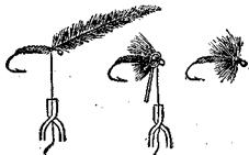 Рис. 1. Кончик удилища с прививком: 1 — леска, 2 — прививок, 3 — кончик удилища Современная нахлыстовая снасть более совершенна: она легка, изящна и удобна в обращении. Удилище из 2–3 колен оснащено пропускными кольцами, рукояткой и съемной катушкой. Специальная конусная леска позволяет коротким удилищем делать забросы на расстояние до 25–30 и более метров, а снасть в целом — вываживать крупную рыбу, по весу превосходящую прочность лески. Подлесок так же, как и леска, имеет конусную форму и заканчивается поводком с искусственной мушкой, которую можно легко и быстро менять (рис. 2).