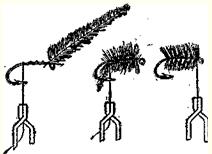 Рис. 14. Последовательность вязки сухой мушки. Модель I Модель I (сухая мушка) изображена на рис. 14. Крючок № 5, № 6 зажимают в тисочки затылочной частью вверх. Наматывают тонкое брюшко из шелковых или шерстяных ниток. Конец пера, взятого с гривки петуха, надежно приматывают швейным шелком впереди брюшка (в 2–3 мм от колечка крючка). Перо берут за конец, натягивают перпендикулярно цевью и обматывают им переднюю часть брюшка. Свободный конец пера закрепляют шелковой ниткой, вращая ее в обратную сторону намотки пера. Специальным колечком из проволоки отклоняют ворс пера назад и закрепляют в таком положении, обматывая переднюю часть ежика ниткой. Впереди делают головку, конец нитки затягивают петлей и дважды покрывают спиртовым лаком. Расцветка: брюшко темно-желтое (или коричневатое, серое), а перо рыжее; или брюшко серое (или черное) и перо такого же цвета. На такую мушку ловят ельца, головля, подуста, язя и другую рыбу.