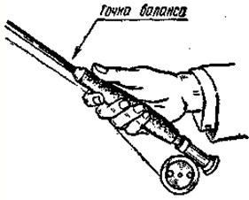 Рис. 6. Типовые модели приманок: 1с, 2с, Зс — сухие мушки, 4 м, 5 м, 6 м — мокрые мушки, 7ф — фантазийная приманка, 8мб — мухо-блесна, 9 — девон, 10, 11 — мелкие блесны, «сибирские мушки» («козявки»); 12, а — харюзовая грузовая, 12,6 — харюзовая верховая, 13 — ленково-тайменья грузовая В течение сезона ловли и в процессе ловли мушки меняют, подбирая наиболее близкую по форме и окраске к тем насекомым, которыми питается в данное время рыба. Иногда стоит только поставить мушку другого цвета, как рыба сразу начинает хватать ее. Поэтому необходимо иметь под рукой запас разнообразных мушек. Техника забросаДля каждого удилища подбирают свою леску. Чем жестче и мощнее удилище, тем тяжелее должна быть леска. Для одноручных удилищ берут леску весом от 24 до 40 г. Существует несколько приемов заброса. Рассмотрим один из них — основной. Он состоит из трех моментов: взмах удилищем назад — пауза — взмах вперед. Все движения удилища лежат в вертикальной плоскости. Удилище держат в правой руке, как указано на рис. 7. Обратите внимание на большой палец — он вытянут вперед.