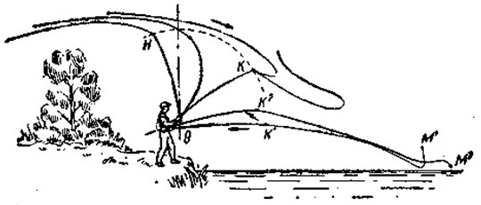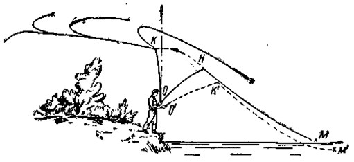 Рис. 11. Взмах назад; развертывание и прямление лески сзади: Я — начало взмаха, К — конец взмаха, О — точка приложения силы, О'К'М1 — положение руки удилища и лески с затонувшей мушкой Леска в момент остановки удилища, получив импульс от толчка, изгибается петлей в виде шпильки. Впереди летит петля. Коренная часть лески (привязанная к удилищу) удлиняется, а ходовая — сокращается до тех пор, пока не выпрямится. Развертывание и прямление лески идет неравномерно. По мере облегчения конца лески (особенно ее конусной части) развертывание ускоряется, отчего кончик ее в последний момент опрокидывается вниз. Если во время развертывания дернуть коренной конец лески на себя (назад), то это так ускорит развертывание, что конец ее щелкнет. Наоборот, подача коренной части ослабит натяжение лески и скорость развертывания уменьшится. Во время ловли при затонувшей мушке сразу посыл лески назад делать нельзя — можно сломать удилище. Взмах назад можно делать лишь после того, как мушка выведена на поверхность воды. Для этого конец удилища поднимают с нарастающим ускорением. Когда удилище поднято до исходного положения (под углом 45°), мушку снимают с воды и делают взмах назад. Все движения слитны и непрерывны. На рис. 11 показаны два положения: линия О'К'М' — положение руки, удилища и лески при затонувшей мушке (рука вытянута); линия OHM — положение руки и удилища в момент взмаха назад (мушка всплыла, удилище поднято, рука согнута в локте). Самое трудное при забросе — положить мушку на воду раньше лески и поводка, причем опустить ее плавно и в цель. На рис. 12 изображено положение удилища и лески при взмахе вперед. Здесь ОН — начальное положение при взмахе вперед, ОК — конечное. При посыле лески вперед ее направляют не в воду к месту цели, а параллельно поверхности воды. Леска после развертывания вытягивается и застывает над водой, а кончик опрокидывается вниз, и мушка падает первой на воду.