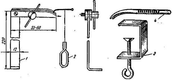 Рис. 13. Инструменты для вязки мушек: 1 — тисочки, 2 — зажим-оттяжка, 3 — струбцинка, 4 — пинцет Имеются специальные крючки для мушек с маленьким колечком, отогнутым вверх или вниз в плоскости изгиба. Размер крючков — № 5 — № 7, для крупной рыбы — до N 14 включительно. Ассортимент мушек разнообразен, каждая имеет свое название и назначение. Познакомимся с изготовлением 2–3 типичных моделей.