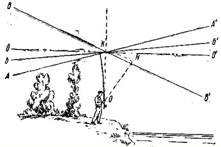 Рис. 10. Держание «верха» Правильным «верхом» следует считать линию ББ' — она несколько ниже горизонта. Заниженный «верх» АА' допустим, когда сзади рыболова находится песок, вода, т. е. нет препятствия. Он позволяет сделать более далекий заброс. Завышенный «верх» ВВ' не позволяет сделать такого заброса. Одним из вариантов этого приема является движение удилища в том же секторе НОК, но с высоко поднятой рукой. В этом случае можно просто взмахнуть рукой, приняв за центр плечевой сустав. Можно также, вытянув руку вверх, принять за центр кисть, лучше маскируясь и, пожалуй, точнее работать. На рис. 11 показано движение удилища и последовательное развертывание лески при взмахе назад. ОН — начальное положение удилища при взмахе, ОК — конечное.