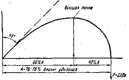 Рис. 2. Нахлыст, общий вид снасти: 1 — подлесок, 2 — поводок, 3 — мушка УдилищеСейчас рыболовы пользуются нахлыстовыми удилищами разных конструкций. Это удилища отечественного изготовления, зарубежные, самодельные. Какие из них лучше? Как самому сделать хорошее удилище, как повысить качество того удилища, которое уже есть у рыболова? Вот некоторые советы на этот случай. Для ловли нахлыстом применяют тонкое, легкое и гибкое удилище: при забросе оно должно изгибаться и быть настолько «чутким», чтобы им можно было ощущать вес и движения лески. К тому же оно должно обладать достаточной упругостью, необходимой для посыла лески. Таким требованиям могут отвечать только клееные удилища из высококачественного зрелого бамбука или из стеклопластика. Слишком тонкие и хлыстоватые удилища, особенно сделанные из незрелого бамбука, будут иметь значительный провес конца от собственной тяжести й, не обладая достаточной жесткостью, они не в состоянии метать даже легкую леску. Излишне жесткие удилища не будут «ощущать» леску. Все сказанное в главе о спиннинговом удилище, о его форме, строе и мощности целиком относится и к нахлыстовому, с той лишь разницей, что оно должно метать не тяжелый груз, а леску без грузила, с легчайшей приманкой. Если удилище установить под углом 45° к вертикали и изогнуть его конец до горизонтали, лежащей на одном уровне с комелем, то вес груза, изгибающего удилище, должен быть в пределах 200–350 г (рис. 3). Основание кривой А у упругого удилища равно 76–78 % длины удилища, а перпендикуляр, опущенный из высшей точки кривой на основание, делит его на две части: 40 % в сторону вершимы и 60 % в сторону комеля.