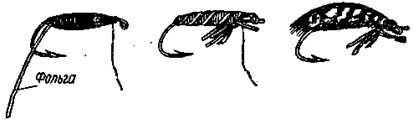 Рис. 15. Последовательность вязки сухой мушки. Модель II, «Пальмер» Модель II (сухая мушка) — рис. 15. Эта наиболее распространенная мушка сделана в форме ежика, известна под названием «Пальмер». Вяжут ее в таком порядке. Крючок, зажатый в тисочки, смазывают густым шеллачным лаком. Перо из гривки петуха очищают от пуха и обрезают очйн, кончик ствола очищают от ости и приматывают крепежной нитью к цевью крючка в 2–3 мм от ушка. Крепежную нить переносят к затылочной части крючка и ставят зажим-оттяжку (рис. 15, а). Удерживая перо в натянутом положении, обматывают им цевье крючка до затылочной части, закрепляют конец пера несколькими петлями крепежной нити (рис. 15, б), обрезают оставшийся конец пера. Образовавшийся ежик обматывают крепежной нитью по вытянутой спирали от затылка крючка до колечка, стараясь не прижимать ость пера. Обмотка нитью делается в сторону, обратную намотке пера. Если перо наматывалось по часовой стрелке, то нить наматывается против часовой стрелки. Ость пера в передней части ежика Отклоняют немного назад наматыванием ниток и делают головку мушки. К крючку с лопаткой до изготовления мушки привязывают поводок. Место привязки обматывают ниткой, когда делают головку мушки, и покрывают лаком. Расцветка мушки может быть рыжей, белой, черной. На эту мушку ловят многих рыб. Модель III (мокрая мушка) — рис. 16. Эту мушку можно изготовить без инструмента и без крепежной нити. Одинарный или двойной крючок (с разводом под углом 30°) держат так, чтобы цевье оставалось свободным. К затылочной части крючка цветной хлопчатобумажной нитью приматывают узкую полоску фольги. Той же нитью плотными рядами в несколько слоев обматывают стержень крючка, придавая обмотке форму брюшка мушки. Конец обмотки закрепляют петлей в головной части. Брюшко обматывают по спирали фольгой, конец ее закрепляют в головной части двумя-тремя оборотами нитки. Снизу, в передней части брюшка, приматывают три пары ножек из ниток мулине так, чтобы 4 ножки были направлены назад, а 2 вперед. Сверху к передней части брюшка приматывают черными нитками четыре крылышка: два справа и два слева (крыло и подкрыльник). Крылья делают из парных перьев дикой утки (серые с черными р. азводами). Ставят крылья в сложенном виде, закрывая ими верхнюю сторону брюшка. Возле колечка или лопатки крючка делают головку мушки из черных ниток. Головку покрывают лаком.