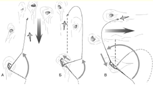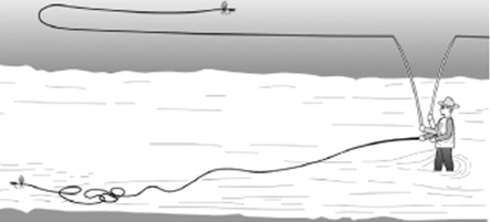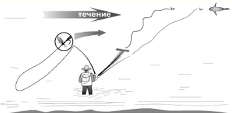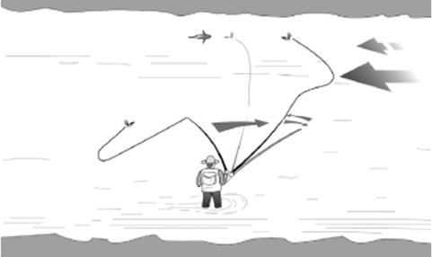 Рис. 8. Волнообразный заброс Все перечисленные способы заброса расслабленным шнуром, особенно в сочетании с «Mending», дадут возможность облавливать участки реки, находящиеся несколько ниже по течению относительно рыболова, а также увеличат время свободного дрейфа снасти в местах, где течение разбивается на несколько струй, имеющих различную скорость. Еще одна модификация вертикального заброса, которая значительно облегчит ловлю на мокрую муху в реках с очень быстрым течением и сэкономит время при поиске рыбы – заброс наискосок к течению– «The Tilt Cast». Суть его заключается в следующем. При общепринятом забросе, для сохранения контроля над мухой (шнур должен быть натянутым) нам приходится после подъема снасти из воды выполнить серию холостых взмахов для придания забросу нужного направления. Но стоит, поднимая снасть из воды, отвести удилище в сторону, а не назад, как преимущество этого заброса станет очевидным, так как количество холостых взмахов уменьшится минимум в 2 раза. Каждый из описанных забросов обладает как определенными преимуществами, так и характерными недостатками. Например, заброс выпрямленным шнуром – «Straight Line Cast», выполненный поперек течения, не обладает достаточной дистанцией свободного дрейфа мухи (рис. 9). Но при условии правильного выполнения часто завершается самопроизвольной подсечкой. Версии за-бросов извитым шнуром практически исключают такую возможность, зато позволяют облавливать более значительные участки.