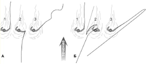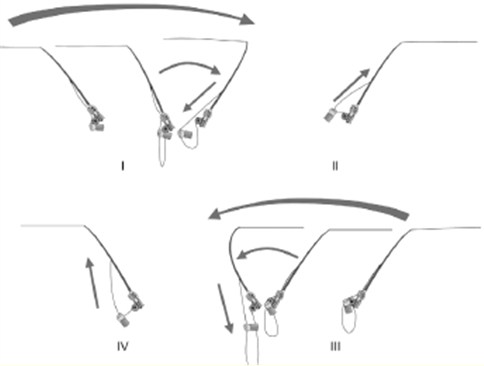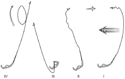 Рис. 7. Забросы поперек реки: I – стягивание снасти течением; II – «Mending» выполняется кистью; III – положение шнура после манипуляции При сильном ветре забросы с образованием широкой петли невозможны. В этой ситуации применяется специальный заброс, называющийся «Wind Slack Cast». Он выполняется в зависимости от направления ветра в различных плоскостях с созданием узкой петли, но при заключительном взмахе вперед, в момент выпрямления шнура, резким рывком левой руки подтягиваем его на себя. Инерция шнура гасится, и он опускается на поверхность воды извитым. Существует еще способ положить шнур на воду расслабленным. Он известен как волнообразный заброс– «Stutter Cast» (рис. 8). Отличается от обычного вертикального заброса тем, что после заключительного взмаха вперед кончиком удилища производим частые колебания в горизонтальной плоскости и чем раньше мы их начнем, тем большая часть снасти (включая шнур, подлесок и поводок) примет волнообразную форму.