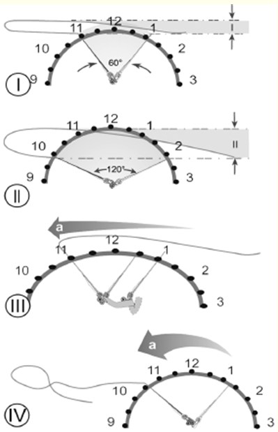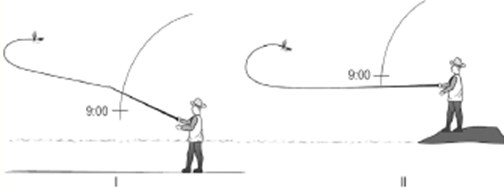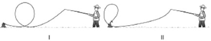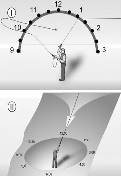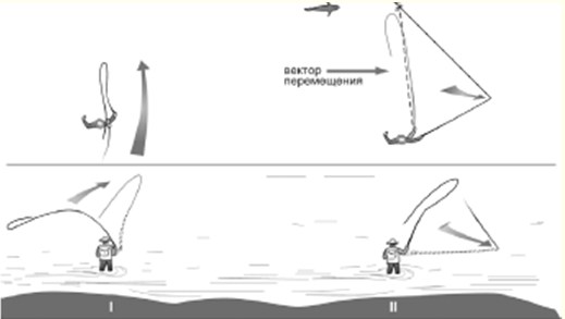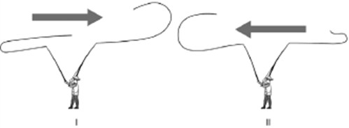 Рис. 10. Заброс шнура с переносом: I – взмах вперед; II – перенос (вытягивание) шнура ВНИМАНИЕ: для выполнения такого заброса необходимо соблюдать следующие условия: 1) движения должны быть плавными, угол между крайними положениями удилища превышает 60°. При этом образуется более широкая петля, которая и дает возможность расположить (вытянуть) шнур в стороне от траектории заброса; 2) муха должна сесть на воду раньше шнура. Для этого сектор перемещения удилища при холостых движениях должен располагаться в промежутке между «10.00» и, скажем, «12.30».