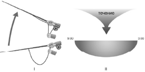 Рис. 11. Варианты применения заброса с вытягиванием шнура: I – заброс поперек течения; II – заброс против течения В результате снасть располагается в стороне от вектора перемещения мухи, что увеличивает время свободного дрейфа, а при забросах против течения позволяет провести муху не за подлеском и поводком, а в стороне от них. Кроме того, выпрямленный шнур дает возможность своевременной подсечки (рис. 11). Когда рыба находится ниже по течению относительно рыболова, также возникает необходимость увеличить свободный дрейф мухи. В этом случае мы применяем маневр, позволяющий удлинить шнур (рис. 12). Он называется «Feeding» (подпитка) и выполняется следующим образом: 1) после заброса стягиваем левой рукой часть шнура с катушки и фиксируем указательным пальцем правой руки так, чтобы образовалась петля между нижним кольцом удилища и правой рукой; 2) резким движением (кистью) удилища вверх выбрасываем образовавшийся за счет петли излишек шнура. Обычно эта манипуляция выполняется неоднократно, и сочетание ее с «Reach Cast» позволяет облавливать участок, располагающийся ниже рыболова по течению в секторе от «3.00» до «9.00» (рис. 12).