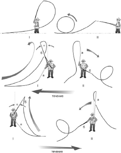 Рис. 25. Лососевый заброс Кольцевой заброс двуручным удилищем («Spey Cast» и «Double Spey Cast»)Впервые эти забросы стали применяться в Шотландии на реке Spey, где из-за прогуливающихся по бульвару людей нельзя было отбрасывать шнур назад. Такие забросы применяются при ловле двуручным лососевым удилищем и позволяют за один взмах изменить направление полета шнура на 90°. «Spey Cast» используется с левого берега реки. Шнур подтягивается под удилище (рис. 26, I), как и при кольцевом забросе, но петля, образованная шнуром, располагается не за рыболовом, а справа, немного выше против течения. Причем размер петли значительно больше, чем таковой при обычном кольцевом забросе. Практически вырываем из воды весь шнур, и только подлесок скользит по воде. Когда муха находится напротив нас, толкаем удилище вперед, изменяя направление заброса (рис. 26, II). При этом шнур летит уже над удилищем поперек течения. Момент заброса шнура вперед очень важен. Любое опоздание или, напротив, преждевременный взмах удилищем вперед приводит к неудачному забросу.