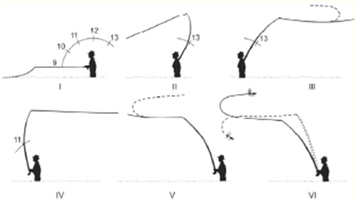 Рис. 4. Фазы вертикального заброса Поскольку мы уже разобрали основные характеристики классического нахлыстового заброса, то во избежание повторения далее будем рассматривать лишь технические особенности и некоторые ошибки, присущие каждому конкретному виду заброса. I. Выпрямляем перед собой 5–9 м шнура (рис. 4). Удочка при этом находится на «9.00» воображаемого циферблата. Шнур фиксируем, прижимая либо указательным пальцем правой руки к рукоятке, либо просто держим в левой руке. II. Движением руки назад с фиксированным шнуром переводим удилище в позицию на «13.00». III. В положении на «13.00» выдерживаем паузу, во время которой шнур должен пролететь над удилищем и выпрямиться сзади. ВНИМАНИЕ: шнур должен выпрямиться полностью, что можно ощутить по удилищу. IV. После выпрямления шнура опять с ускорением переводим удилище в положение на «11.00». V. Шнур, перелетев над удилищем, выпрямляется в воздухе уже впереди. VI. Чтобы муха правильно «села» на воду, необходимо сразу же после выпрямления шнура, в последней фазе заброса, освободить его и одновременно немного приподнять кончик удилища вверх. При выполнении заброса стараемся максимально использовать упругость удилища. Чтобы высушить муху, иногда приходится выполнять дополнительные, так называемые «слепые» или холостые взмахи удилищем в интервале между «11.00» и «13.00». При этом очень важно, чтобы перемещение удилища производилось не равномерно, а со значительным ускорением и резкой остановкой на «11.00» и «13.00». Для того чтобы избежать запутывания подлеска, эти взмахи (вперед и назад) выполняются в разных плоскостях. Кончик удилища при этом описывает эллипс или «восьмерку». В завершающей фазе заброса при взмахе вперед в момент выпрямления правой руки производим кистью резкий толчок и останавливаем удилище под определенным углом к поверхности воды. Этот заключительный акцент формирует еще более узкую петлю и увеличивает дистанцию заброса. Величина угла относительно поверхности воды при остановке удилища зависит от дистанции заброса (или длины шнура) и положения рыболова над водой (рис. 5). Если этот угол будет недостаточным, то шнур громко «хлестнет» по поверхности воды. Если же угол будет, напротив, чересчур большим, то шнур упадет на воду невыпрямленным. При правильном выполнении всех перечисленных моментов муха упадет на воду на полностью ровном, неизогнутом шнуре.