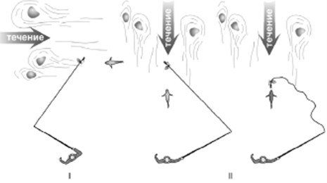 Рис. 1. Циклограммы, иллюстрирующие вертикальный заброс (I) и направление заброса по отношению к направлению течения (II) Заброс нахлыстовой удочкой в корне отличается от забросов любыми другими рыболовными снастями, так как фактически мы забрасываем не муху, а обладающий определенным весом шнур, который, перелетая над удилищем назад и вперед, изгибается (разворачивается) в виде петли. Образованная шнуром петля обладает тремя характеристиками: размером, формой и направлением (траекторией движения). Размер, или ширина, петли зависит прежде всего от угла между крайними положениями удилища при взмахе. Оптимальным следует считать угол около 60° (рис. 2, I). При увеличении этого угла (рис. 2, II) ширина петли будет увеличиваться.