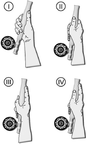 Рис. 2. Характеристики нахлыстового заброса Форма петли определяется ускорением, которое мы придаем удилищу при взмахе. Недостаточное ускорение не сформирует необходимую для перемещения шнура петлю, и он упадет около рыболова. А слишком мощное ускорение приводит к тому, что перегруженный вследствие неравномерной нагрузки конец шнура вместе с подлеском и мухой начнут «обгонять» образованную петлю. Это ведет к формированию так называемой «хвостатой» петли (рис. 2, IV) и, как следствие, к спутыванию снасти, что часто происходит в случаях, когда мы, желая как можно дальше забросить муху, прикладываем слишком большое усилие при взмахе. Для того чтобы этого не произошло, любой заброс должен производиться не только предплечьем и кистью, но и всей рукой (рис. 2, III). Похожее движение выполняют спортсмены при толкании ядра. Поступательное движение удилища позволяет более равномерно распределить нагрузку на шнур, и петля принимает правильную форму. Дистанция заброса увеличится. Направление петли зависит от направления перемещения удилища относительно рыболова (вперед и вверх, назад и влево и пр.). Во избежание столкновения шнура с удилищем необходимо, чтобы взмахи вперед и назад производились в разных плоскостях. Более того, направление петли обусловливает расположение шнура на воде. О том, насколько это важно, вы поймете при описании усовершенствованных и специальных забросов. Что касается положения руки на рукоятке удилища, то в литературе описаны четыре способа: 1) пальцы и ладонь обхватывают рукоять, а большой палец лежит на ней сверху; Испытав указанные способы, я так и не смог определить оптимальный для себя, а через какое-то время понял, что пользуюсь всеми по очереди, т. е. если устает рука, я машинально меняю способ захвата рукояти удилища.