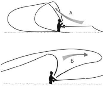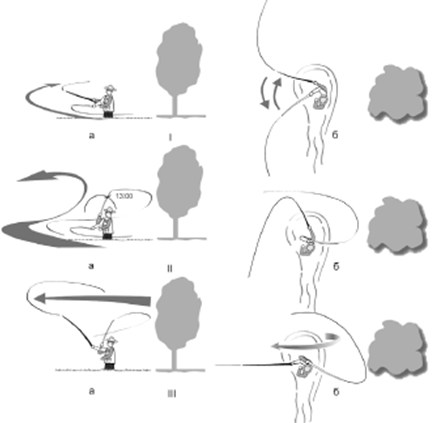 Рис. 16. Использывание кольцевого подъема при зацепе мушки Специальные забросыЗабросы, применяемые при ветре («Wind Casts»)I. При ловле против ветра выполняем вертикальный заброс, но петля шнура при взмахе вперед (против ветра) должна быть узкой, а при взмахе назад (по ветру) – широкой (рис. 17).
