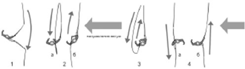 Рис. 20. Заброс с подъемом шнура над препятствием сзади ВНИМАНИЕ: старайтесь контролировать (наблюдать) полет шнура при взмахе назад. Взмах вперед производится плавно, что позволяет избежать образования «хвостатой» петли, так как угол перемещения удилища будет составлять что-то около 90° и ускорение не должно быть слишком выраженным. Для увеличения дистанции заброса заключительный взмах вперед можно завершить более или менее энергичным толчком (сгибанием) правой кисти. Заброс с двойным подтягиванием шнура («Double Haul Cast»). В публикациях на русском языке данный заброс называется скандинавским. Это практически модификация вертикального заброса, применение которой позволяет увеличить скорость полета шнура, а значит, и дистанцию заброса (рис. 21).