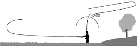 Рис. 19. Изменение направления заброса: I – разворачиваем шнур перед собой; II – перевод шнура из горизонтальной плоскости в вертикальную; III – взмах вперед Заброс с подъемом шнура («Steeple Cast»)Применяется в ситуациях, когда позади рыболова находятся кусты или другие объекты, мешающие обычному вертикальному забросу (рис. 20). При выполнении заброса взмах назад производится энергичным движением правой руки назад и вверх (локоть не должен быть прижат к туловищу и в этом движении участвует вся правая рука). Для образования узкой петли взмах завершается резким дополнительным разгибанием кисти в лучезапястном суставе, переводя удилище в положение «12.00». В результате шнур перелетает над препятствиями.