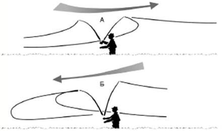 Рис. 24. Заброс под удилищем Этот заброс применяется главным образом для мягкого касания шнура поверхности воды. Также с его помощью можно положить муху под нависающие над водой ветви деревьев. Забросы двуручным удилищемИспользование двуручного удилища изначально предполагает ловлю на больших реках, где свободное пространство для выполнения обычного вертикального заброса, как правило, обеспечено. Здесь приводятся лишь некоторые варианты, которые помогают преодолеть проблемы, возникающие при использовании двуручной снасти. Лососевый забросВыполняя дальний заброс двуручным удилищем, трудно полностью поднять из воды длинный шнур для следующего заброса. На больших реках, где позволяет свободное пространство, можно применять так называемый лососевый заброс. Вытягиваем шнур из воды и перебрасываем его назад под удилищем (рис. 25, а). В отличие от кольцевого заброса необходимо, чтобы он весь пролетел и выпрямился сзади. После выпрямления бросаем его вперед, но уже не под, а над удилищем (рис. 25, б).
