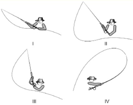 Рис. 15. Маневр «Roll Pick-Up»: I – начало проводки; II – завершение свободного дрейфа мушки; III и IV – подъем кольцом шнура из воды Кольцевой заброс лежит в основе маневра «Roll Pick-Up» – подъем шнура из воды кольцевым способом. Он применяется во многих ситуациях. Например, при ловле поперек течения его применение позволяет более аккуратно поднять муху из воды и быстро изменить направление заброса (рис. 15). Также он полезен при прямых забросах вверх против течения (особенно при ловле на сухую муху). В ситуации, когда течение несет шнур прямо на рыболова, просто поднимаем конец удочки вверх без подтягивания шнура («Stripping») и после образования петли, которая формируется вследствие течения, кольцевым способом поднимаем шнур из воды (рис. 16). Также его можно использовать при зацепах мухи за какие-то объекты, так как разворачивающаяся по шнуру петля способна «выбить» вонзившуюся муху, скажем, из торчащего над водой пня.