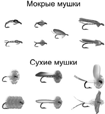 Рис. 9. Типы искусственных мушек Здесь пока речь шла лишь о мушках для ловли рыбы (fishing flies). Но, возможно, кто-то обратил внимание на промелькнувший выше термин «реалистичная мушка». Это понятие далеко не однозначное и определяется степенью достоверности имитации натуральных организмов, составляющих пищевой рацион рыб. Однажды во время проведения очередных клубных соревнований по нахлысту у костра возникла беседа по поводу реалистичных мух и целесообразности их применения при низкой активности рыб. Было задано много вопросов, но большинство из них осталось без ответа. Позже, просмотрев какое-то количество статей на эту тему и массу вариантов реалистичных мух, предлагаемых в различных источниках, я выяснил, что у каждого создателя мух по этому поводу имеется собственное мнение и каждый по-своему прав. В результате такого анализа и возникла довольно ироничная, на мой взгляд, классификация искусственных мух, основанная на степени достоверности внешнего вида имитации своему естественному прообразу. Итак, любые существующие искусственные мушки (рис. 9) подразделяются на: 1) «натуральные» искусственные мушки. Это ничто иное, как забальзамированный естественный организм, прикрепленный к крючку. Чаще всего используют для этой цели находящихся в чехликах («домиках») личинок ручейника или бокоплава, покрытого тонким слоем прозрачного лака. Об уловистости таких приманок мне ничего не известно. Я даже не уверен, можно ли причислять эти «изделия» к искусственным мухам, требования к которым четко предусмотрены правилами любительского рыболовства; 2) реалистичные (абсолютные копии) искусственные мушки. Данные «произведения искусства» идеально повторяют свою реально существующую в природе модель. Более справедливо называть их «клонами», нежели имитациями. Чаще всего такие изделия можно увидеть на конкурсах по вязке мух и в коробках исключительно богатых эстетов. Преимущественно это имитации раков, личинок веснянок и прочих крупных организмов. Они отличаются от остальных тем, что не предназначены для ловли. Сама мысль о том, что это бесценное творение при соприкосновении с водой потеряет свой облик или, не дай Бог, вообще будет оборвано каким-либо подводным «монстром», вызывает такой тремор, что привязать ее к поводку не представляется возможным; 3) искусственные мушки, в основе изготовления которых лежит общепринятый принцип имитации конкретного существующего в природе организма. Эта группа включает в себя большинство мух, описанных в различных статьях, мудрых книгах и специальных каталогах, где они часто демонстрируются вместе с их естественными прототипами. Кое-кто даже утверждает, что результативность таких мух пропорциональна фонетической сложности латинского названия их натурального прообраза (например, Aphelocherius aestivalis). А консервативные британцы вообще убеждены в том, что эффективными могут быть лишь имитации организмов, обитающих в водоемах туманного Альбиона. По их мнению, коробка с такими мухами всегда должна присутствовать в рыболовном жилете нахлыстовика; 4) обобщающие имитации. Эти мухи целенаправленно вяжутся так, что бы имитировать не какой-то определенный организм, а многих сходных по внешнему виду. Подобные приманки одновременно прекрасно изображают бокоплава, водяного ослика, различных личинок большинст