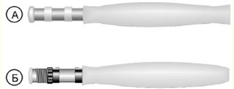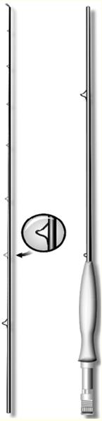 Рис. 2. Соединение нахлыстового удилища на карбоновом штырьке Направляющие кольцаВ настоящее время нахлыстовые удочки оборудуются как обычными кольцами с керамической вставкой, так и считающимися традиционными для этой снасти змейковыми кольцами, изогнутыми из проволоки. Предпочтение следует отдать традиционным кольцам, так как они значительно легче и не меняют строй удилища. Кроме того, во время ловли при низкой температуре они не столь быстро обмерзают, нежели кольца с керамической вставкой. Рукоять и катушкодержательУ большинства нахлыстовых удочек рукоять изготавливается из пробкового дерева и только у самых дешевые моделей – из синтетической резины. По форме можно выделить два характерных типа рукоятей: классический и сигарообразный (рис. 3). Катушкодержатели также бывают двух типов. На удочках легких классов они могут быть облегченными, состоящими из двух зажимных колец (рис 3, а). На удочках средних и тяжелых классов устанавливается винтовой катушкодержатель (рис. 3, б).