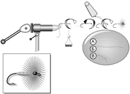 Рис. 6. Нахлыстовые катушки Искусственные мушкиИскусственная муха представляет собой более или менее верную имитацию насекомого или другого организма во всех стадиях его развития. Вяжут (изготавливают) ее на крючке, применяя для этого различные перья, шерсть диких и домашних животных, разноцветные нити, синтетические материалы и многое другое. Изготовление мушек – занятие не столь уж и сложное, но достаточно увлекательное. Во всяком случае, муху, способную спровоцировать рыбу к поклевке, сможет связать любой желающий. Конечно, существуют довольно сложные рецепты вязки (реалистичные и классические лососевые мушки) и трудоемкие для этого процесса материалы, но чаще всего это не имеет под собой никакой практической основы. Поэтому если при вязке искусственной мушки исходить только из ее прямого предназначения – ловли рыбы, то такую мушку может связать даже ребенок. Процесс вязки искусственной мушки в целом не что иное, как закрепление необходимых материалов на цевье крючка в определенной последовательности. Если еще проще, мы просто приматываем к крючку нитки, накручиваем и прижимаем нитками перышки. А пресловутая сложность вязки обусловливается доступностью подходящих материалов. Чем эти материалы качественнее, тем мушку легче связать. А вот какие материалы – перья курицы, петуха, шерсть или шелк и пр. – все довольно конкретно указано в специальных каталогах. Для примера опишу процесс вязки самой простой мушки (hackle), именуемой в просторечье пушинкой (рис. 7). На крючок наматывается вязальная нить от колечка до изгиба цевья. Там ниткой фиксируется сначала обмотка (ее роль обычно выполняет люрекс, металлическая проволочка, леска или обычная нить контрастного с материалом тела цветом). Затем тоже вязальной нитью прижимается к крючку материал, из которого будет формироваться тело мушки. Это может быть шелк, натуральный или искусственный даббинг. К слову сказать, даббинг можно сделать самому (рис. 8). Для этого следует нарезать небольшое количество необходимой расцветки шерсти (искусственной или натуральной) длиной 0,8–1,5 см и размешать ее в электрокофемолке. Получится нечто вроде ваты, что достаточно легко формируется пальцами на вязальной, предварительно обработанной клеем или воском нити. Нанеся растянутые волокна даббинга на вязальную нить, прокручиваем их между ладонями. Затем на крючок наносим немного клея (лака) и по ходу вязальной нити наматываем шелк (даббинг), формируя конусное тело мушки, и затем фиксируем его (связанное тело) двумя-тремя оборотами нити, оставив при этом место для ножек и головки. Излишки даббинга отрезаем. Четырьмя-пятью оборотами навиваем обмотку на тело, при этом направление витков должно быть противоположным тому, которое производилось при намотке тела. Закрепляем обмотку вязальной нитью, излишки ее отрезаем и тут же прижимаем нитью перышко для ножек мушки, которое и накручиваем плотно виток к витку. Зафиксировав образовавшийся из пера воротничок нитью, отрезаем оставшийся кончик пера и вязальной нитью формируем головку мушки. Для ножек используются перышки со скальпа петуха, курицы, совы и т. д., в зависимости от того, какую мушку вы предполагали связать – сухую или мокрую. Даже при небольшом навыке на весь процесс уходит не более 3–5 мин, и такая мушка уже способна инициировать атаку рыбы. Р