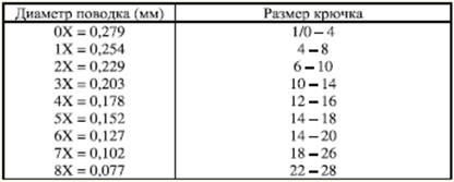 Таблица 3. Плетеные конические подлески В настоящее время ряд фирм производит тонущие конические подлески, которые и по технологии изготовления, и по внешнему виду мало чем отличаются от тонущих шнуров. Принципиального отличия от плетеных тонущих подлесков, описанных выше, нет. Для создания отлаженной нахлыстовой снасти необходимо подобрать подлесок и поводок, соответствующие классу шнура и мухам (табл. 4). Руководством для выбора такого поводка может служить следующая формула. Надо разделить размер крючка мухи на 4 и прибавить 1, что будет равно Х – размеру поводка. Если, например, мы ловим на муху, связанную на крючке № 16, то поводок должен быть 5Х. Таблица 4. Рекомендуемый диаметр лески для мух, связанных на крючках указанных размеров При сборе нахлыстовой снасти (рис. 5) рекомендуют предварительно на катушку намотать шнур и продолжить его подкладом, не доходя до края шпули на 4–6 мм и затем процесс повторить в обратном направлении, уже окончательно намотав вначале бэкинг, затем шнур, подлесок и поводок. Этот дополнительный шаг позволит без особых хлопот рассчитать необходимое количество подклада.