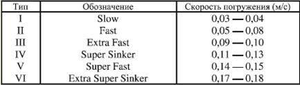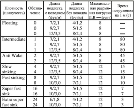 Таблица 2. Монофильные конические подлески Кроме монофильных подлесков существуют плетеные конические, которые различаются функциями (плавучестью). Иначе говоря, наряду с плавающими моделями существуют и тонущие, причем с разной скоростью за единицу времени. Так как первой на рынок их предложила английская фирма «Air Flo», то здесь и приводится классификация (табл. 3) именно ее изделий, тем более, что другие фирмы, выпускающие аналогичную продукцию, придерживаются похожей классификации. Применение таких подлесков дает возможность ловить различными мухами (сухими, мокрыми, нимфами, стримерами), погружая их на требуемую глубину.
