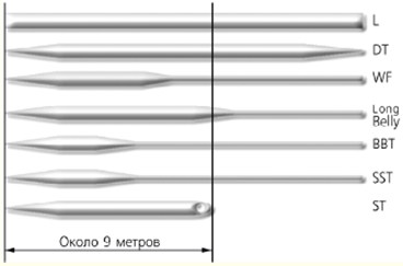 Рис. 3. Типы рукоятей нахлыстовых удочек: А– классическая форма рукояти с облегченным катушкодержателем; Б– сигарообразная рукоять с винтовым катушкодержателем Приобретая нахлыстовую снасть, необходимо обратить внимание на размещение центра тяжести нахлыстового удилища. При присоединенной катушке и пропущенном сквозь кольца шнуре он должен находиться сразу же после рукояти. Более высокое его расположение приводит к быстрому утомлению кисти при ловле. Рыболовы часто забывают об этом. В погоне за суперлегкими снастями они приобретают катушки, корпус которых выполнен из пластмассы и которые в этом смысле совсем не подходят к их удилищам. Нахлыстовый шнурНахлыстовый шнур фигурирует только в нахлыстовой снасти. Его применение дает возможность совершить заброс мухи на нужное расстояние и погрузить ее на определенную глубину. Он заменяет и огрузку снасти, и поплавок, а также является своего рода продолжением удилища. Кроме того, шнур не только располагает мушку в определенном срезе воды, но и в умелых руках предоставляет возможность произвести проводку по такой траектории, которую просто невозможно совершить никакой другой снастью. Характеристики шнуровСуществующее многообразие моделей нахлыстовых шнуров предоставляет современному нахлыстовику широчайшие возможности при выборе способа ловли рыбы. Как правило, начинающий рыболов приобретает сначала плавающий шнур. Но с приобретением опыта (и информации) он начинает задумываться и о других типах шнуров. Выбирая новый шнур, необходимо учитывать следующие его характеристики: 1) вес; Класс AFTMA, или вес шнураОтлаженная нахлыстовая снасть должна иметь соразмерные компоненты. Это означает, что нахлыстовая снасть, в которую мы включаем удилище, катушку, шнур, подлесок и поводок, должна быть сбалансирована для достижения максимального заброса по весу. При описании нахлыстовых удилищ уже упоминалось о существующей классификации AFTMA. Она довольно проста и подразделяет шнуры относительно веса первых 30 футов (9,14 м) от класса 0 (суперлегкий) до класса 15 (супертяжелый для морской рыбалки). Чем выше номер, тем тяжелее шнур. Благодаря этой классификации подбор необходимых компонентов снасти значительно упрощается, потому что индустрия нахлыстовых изделий следует общему стандарту маркировки. Например, предприятия, изготавливающие удилища, маркируют их прямо на стержне, так что удилищу 6-го класса будет соответствовать и шнур 6-го класса. Это действительно и для большинства катушек. Определяющим моментом при выборе шнура обычно является размер мухи. Чем муха меньше, тем легче шнур. Но и из этого правила могут быть исключения, которые вызваны воздействием чистоты и плотности воды, погодой, видом рыб. Исходя из сказанного выше, было бы логично приобретать сначала шнур, а затем уже все прочие компоненты снасти. Однако так уже сложилось, что вначале приобретается удилище, а потом – все остальное. Шнуры легких классов Шнуры 2-го и 3-го класса предназначены для ловли небольших рыб очень маленькой мушкой. Оптимальная длина заброса этим шнуром составляет около 12 м. Необходимо отметить, что из-за легкого веса ими трудно управлять при ловле во время ветра. Шнуры этих размеров применяются с мухами размером 16–22 (номер крючка по классификации Redditch) с поводками и подлесками 5Х—8Х. Наиболее тяжелы