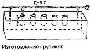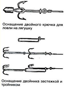 Первый вариант. Двойной крючок № 10—12 оснащается двухколенным стальным поводком из достаточно гибкой проволоки толщиною 0,2—0,3 мм. Первое колено поводка, прилегающее к крючку, делается длиной 40—50 мм, второе— 150—200мм. Во избежание закручивания лески к верхнему концу поводка прикрепляется карабин. Второй вариант. К двойнику таких же размеров припаивается застежка, на которую надевается двойник или тройник с удлиненным стержнем. В том и другом случае на двойник привешивается грузик весом 4—6 г, который через рот вводится внутрь лягушки. Он способствует лучшему забросу и углублению приманки. На мелких водоемах с подводной растительностью грузик не применяется. Изготовление снасточекДвойник для снасточки первого варианта пропускается сквозь петлю поводка, и цевье связывается ниткой или тонкой медной проволокой. Для изготовления застежки к снасточке второго варианта берется стальная проволока диаметром 0,5—0,6 мм или английская булавка средних размеров. Проволока или булавка укладывается между стержнями цевья и приматывается медной тонкой проволокой, предварительно очищенной наждачной шкуркой. Место примотки спаивается, промывается водой и протирается чистой тряпочкой. Затем (если застежка изготавливается не из булавки) проволока при помощи плоскогубцев загибается в противоположную сторону от крючков так, чтобы изгиб ее выходил за пределы изгиба крючков на 5— 6 мм. На свободном конце проволоки выгибается петля-застежка, которая должна охватывать цевье. Изготовление грузиковИз твердых пород древесины выстругивают брус, на одной из граней которого просверливают отверстия диаметром 6—7 мм на глубину 10—12 мм. Из стальной проволоки диаметром 0,5—0,6 мм изготавливают дужки, которые подвешиваются на толстую проволоку так, чтобы концы дужек входили в отверстия на глубину 4—5 мм. Отверстия заливаются расплавленным свинцом и после его охлаждения грузики вынимаются.