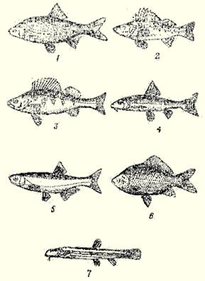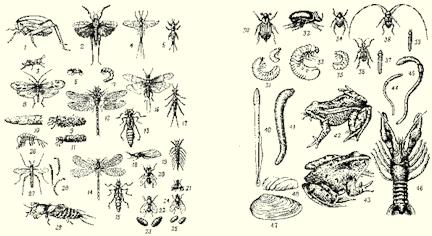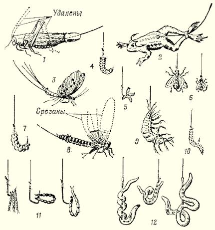 Рис. 1. Виды живцов: Особое внимание рыболов должен обращать на сохранение живца. Вялый (засыпающий) живец для ловли не пригоден. При ловле живца удочкой его надо аккуратно снимать с крючка и быстро опускать в садок или в специальный кан. Наловленных живцов опускают в воду на небольшую глубину в прохладном месте у берега. Привязывать садок или кан к лодке не рекомендуется. Это мешает ходу лодки, а главное, при движении лодки живцы сильно бьются о стенки садка и быстро засыпают. При перевозке живца летом рекомендуется класть в кан лед, иначе в теплой воде живец погибнет. Если живец в садке или в другом сосуде всплывает боком или высовывает из воды голову и заглатывает воздух, надо немедленно сменить воду. При этом разность температуры сменяемой воды не должна превышать 4°. Для пополнения запаса кислорода в воде хорошо пользоваться пульверизатором. Чем меньше в посуде живцов и чем больше объем посуды, тем дольше живцы в ней сохраняются. Поэтому в ведро или садок не рекомендуется помещать больше 12–15 живцов. Если нужен большой запас живцов, лучше пользоваться другой посудой. Нельзя также хранить вместе живцов разных видов рыб, например ершей и плотвичек, так как выделяемая слизь ерша и его колючие плавники губительно действуют на остальных живцов. При перевозке живцов на дальние расстояния лучше всех выживает карась: он менее требователен к кислородному режиму. При температуре 1–5° тепла карася можно хранить без воды до 20 часов. Чем выше температура воздуха, тем меньше живучесть карася. Для повышения живучести карасей в летнее время рекомендуется поверх мха класть кусочки льда. Бойкий живец требуемого вида — одно из важнейших условий успешной ловли хищных рыб. Для ловли некоторых хищных рыб употребляется малек. Малька следует хранить так же, как и живца, но в садке его, конечно, будет помещаться больше. Ловят малька чаще всего у водной растительности. Для этого опускают малявочницу (подъемник 1x1 м) на дно, бросают туда мокрые хлебные крошки и затем плавно поднимают. Из сетки малька нужно выбирать не руками, а сачком. Чтобы малек не засыпал, надо как можно чаще менять воду. Хищных рыб ловят и на блесны, имитирующие живца или малька. Иногда бывают такие периоды, когда некоторые рыбы лучше ловятся на блесны, чем на живца. Блесны бывают колеблющиеся, вращающиеся и для отвесного блеснения. Совершенно не обязательно, чтобы блесна была похожа на того или иного живца, важно, чтобы блесна хорошо играла в воде. Насадки для ловли «мирных» рыбТаких насадок (рис. 2) очень много. К ним относятся все насекомые и их личинки, живущие на дне рек, озер, прудов и водоемов, которыми питается рыба. Сюда относятся также насекомые и их личинки, которые водятся вне воды. Назовем основные и малоизвестные насадки из рыбьего «рациона». Навозный червь Самыми распространенными насадками для «мирных» рыб являются различные черви, живущие в земле, навозе и в прелых листьях. Лучшие результаты ловли получаются на красного навозного червя, который наиболее длительное время остается живым в воде. Запастись им несложно. Его можно найти вблизи жилья в кучах полуперепревшего навоза, в подгнившей соломе, в парниках. Хранить червя необходимо в сыром холщовом мешочке или в металлической консервной банке, куда вместе с червями кладут и навоз. Чтобы черви из банки не выползали, ее 