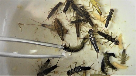 Личинка веснянкиВ отличие от бабочки-веснянки больший интерес для рыболова представляет ее личинка, особенно при ужении в конце ледостава, когда выбор приманок ограничен. Добывают личинку, поднимая со дна водную растительность. Делают это с помощью длинной палки с рогулькой на конце, которую опускают в прорубь и, поворачивая вокруг оси, наматывают пучки травы, а затем поднимают их на лед. Собранных личинок веснянки хранят вместе с растительностью, взятой из водоема.