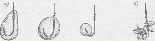 Рис. 1. Насаживание теста, каш, мякиша хлеба (а) и распаренных зерен (б) КартофельДля насадки используют самый мелкий картофель, величиной с лесной орех. Он появляется вскоре после цветения ботвы, и его можно аккуратно подкопать. Картофель варят в слегка подсоленной воде, неочищенным, до того состояния, когда в него довольно легко втыкается вилка. Затем его охлаждают на воздухе, а если нет времени, то в холодной воде. Старый картофель чистят, оставляя кожуру в нескольких местах с завернутыми краями — так рыба лучше клюет. На рыбалке эту насадку хранят в жесткой таре, чтобы не помять. Большой картофель перед ужением режут на куски. Крючки нужны № 6–9. Прокалывать крючком кусок картофелины лучше в двух местах. Целесообразней снять погодок, продернуть его при помощи проволочки сквозь насадку, затянуть или заглубить поддёв крючка полностью в ее массу и затем пристегнуть поводок к леске. А вот другой способ. Кусок картофелины прокалывают ближе к одному краю и пропускают крючок до головки, а затем поворачивают его на 180° и острие с поддёвом Отапливают в массе насадки. Чтобы крючок не вышел наружу применяют следующий способ. Со стороны поддёва на куске картофелины делают выемку размером 15х6х6 мм и вырезают такого же размера кусочек сала, которое надевают на поддёв. Вставленное в выемку сало предупреждает прорезание массы насадки. Мятый картофель является хорошей добавкой для многих растительных приманок. В частности, он употребляется в смеси с непросеянной ржаной мукой. Ловятся карп, сазан, усач, реже плотва. Картофель используется также в качестве привады и прикормки, а при ловле на картофель прикормка обязательна. МорковьПромытую морковь варят в подсоленной воде до неполной готовности, но чтобы она размякла и обладала способностью держаться на крючке. Ее подсушивают на воздухе и хранят в холщовых мешочках или в тряпке. Насаживают на крючок кусочками так же, как и картофель. С ее помощью ловят нехищных рыб на донные снасти. Макароны и вермишельВарят на слабом огне до состояния мягкой резины Откидывают на решете и подсушивают на бумаге. Режут на кусочки и сдабривают нерафинированным подсолнечным маслом. Хранят в чистой тряпочке. На небольшие кусочки вермишели ловят плотву, густеру, подлещиков. Крючки № 3–5 должны быть с тонким цевьем и очень острые. Ловят поплавочной удочкой. На дольки макарон длиной до 60 мм, насаженные на крючки № 4–7, ловят более крупную рыбу и преимущественно донными снастями (рис. 2, а). КлёцкиДля насадки используют обычные клецки, приготовленные к столу. Их обваривают кипятком, подсушивают и укрепляют на крючке как тесто. ЖмыхиУпотребляются различные их виды как для насадки, так и в качестве добавок к другим приманкам, привадам и прикормкам. Для насадки чаще используют свежий конопляный жмых, который разваривают на слабом огне с небольшим количеством муки и разминают до тестообразного состояния, а потом катают шарики разных размеров, обычно с орех (рис. 2, б).