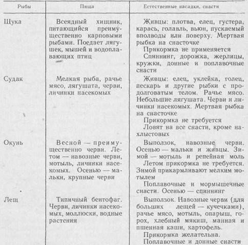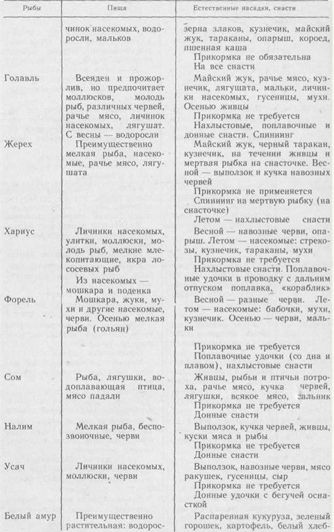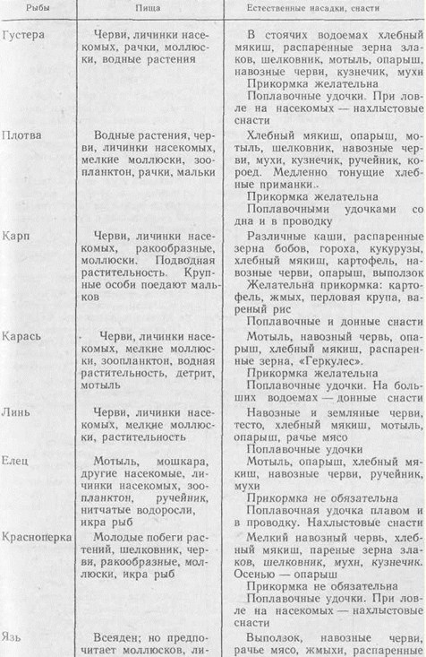 Перед тем, как готовить насадки, поинтересуйтесь, чем питается предполагаемая к ловле рыба в данное время. Используйте мнения на этот счет местных удильщиков. Заготавливайте насадки непосредственно перед выходом на водоем. На свежие приманки рыба клюет охотнее. Чем разнообразнее набор насадок, тем больше возможностей вызвать клев рыбы. При его отсутствии не торопитесь уходить с водоема, не испробовав все насадки. Лучший подсказчик, на какую из них ловить, сама рыба. Для растительных насадок предпочтительнее крючок с коротким цевьем. Он легко маскируется насадкой. Применяйте крючки по цвету близкие к насадке. Придавайте насадке естественный вид. Неправильное ее положение на крючке подозрительно для рыбы. Учитывайте прозрачность воды и степень проникновения в нее света. В пасмурную погоду и в сумерки применяйте более светлые насадки. Сдабривая ароматическими веществами растительные насадки, не допускайте излишеств. Это может отпугнуть рыбу. Движущуюся приманку рыба быстрее замечает и с большей охотой ее берет. Но не старайтесь растительными насадками имитировать что-то живое. Они должны естественно падать на воду, медленно погружаться, сноситься течением или лежать на дне. В последнем случае их можно слегка шевелить. Не злоупотребляйте прикормкой. Рыба может не клевать совсем по другим причинам, или может статься, что в выбранном вами месте ее вообще нет. Не заготавливайте насадок больше, чем требуется для выхода на водоем. Экономьте хлебные продукты. Используйте пищевые отходы, отходы крупорушек, мельниц и пекарен (смётки, отруби и пр.). Не водящихся в конкретном водоеме неизвестных вам рыбок без консультации со специалистами в качестве живцов использовать нельзя! Обращайте внимание на все, что ползает или летает у воды. Можете открыть прекрасную насадку. Не доводите живцов и мальков до кислородного голодания, когда они начинают глотать воздух. Даже при видимом их благополучии чаще меняйте воду. Чтобы облегчить чистку окуня, надо взять его щипцами (прищепкой) за хвост и опустить на 2–3 с в кипящую воду. Затонувшая часть лески выше поплавка иногда цепляется за водную растительность, коряги, камни, что мешает подсекать рыбу. Этого можно избежать, смазав лесу каким-либо жиром. Сохранять от порчи пойманную летом рыбу надо так: при укладке в корзину каждый ее слой отделять крапивой или ветками черемухи. Довольно долго сохраняет свою свежесть рыба, закопанная в сырой прибрежный песок. Неплохо зарекомендовали себя комбинированные насадки. Например, на крючок насаживается червь, а на самое острие жала — распаренный горох, мотыль или опарыш. Плотва и другая рыба часто хорошо ловится на тесто. Но как сохранить его тягучесть и мягкость? Для этого нужно взять тубу из-под любого крема или зубной пасты. Низ тубы отрезать, хорошо промыть и заполнить тестом, а обрезанный край завернуть. Выдавливается тесто во время рыбной ловли обычным способом. По каким признакам определить периоды наиболее интенсивного клева рыбы? Оказывается, и здесь есть свои приметы: зацвела черемуха — начинает бойко клевать голавль; как только расцветает сирень — на реках идет клев плотвы; когда заколосится рожь — смело можно идти на лещей. Карась — рыба капризная. И даже в один и тот же день бывает трудно определить, что ему больше всего по вкусу: на рассвете он 