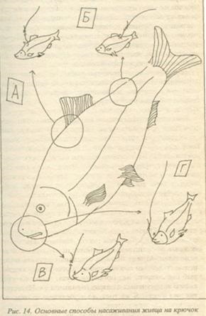 Рис. 1. Основные способы насаживания живца на крючок Изредка на жерлицы сажают карасика и крупную верховку. Карась - рыба теплолюбивая, и поэтому в ледяной воде почти полностью теряет зачатки активности, вследствие чего становится малопривлекательной добычей для хищника. В глубоких малоосвещенных участках водоема щука и судак при отыскании добычи в первую очередь пользуются боковой линией - органом чувств, отдаленно напоминающим по своим функциям человеческие уши. Только этот орган улавливает волновые колебания водной среды, отсеивая различные помехи и концентрируя свое внимание на колебаниях, издаваемых рыбами. Глаза в этих условиях служат второстепенным органом, позволяющим определить хищнику, приблизившемуся к источнику звука, съедобно ли данное существо. Зимой при очень малой освещенности даже верхних слоев воды глубоководный хищник полагается в основном только на боковую линию и чем бойчее будет живец, тем скорее загорится флажок. Это популярное объяснение строения органов чувств рыбы должно убедительно показать жерличникам целесообразность применения того или иного вида наживки. Некоторые искушенные рыболовы могут меня спросить в отношении поимки хищников, в особенности судаков, на кусочки рыбы. Да, тут я поднимаю обе руки вверх, тут уж теория волновых колебаний водной среды применительно к боковой линии хищника терпит крах. Действительно, на некоторых водоемах и лично знакомом мне Белом озере, на берегу которого основан град Белозерск, местные рыбаки ловят судака и щуку, наживляя на крючки переметов кусочки белой рыбы. Ну, если бы на течении насаживать на крючок хвостик, скажем, пескаря, тогда еще куда ни шло -там поток воды постоянно двигает приманку, заставляя ее излучать колебания лопастью хвостового оперения. Но вот почему судак, уподобляясь налиму, подбирает со дна кусочки филе, когда вокруг полно другой поживы, трепещущей при поимке на зубах, - вот это непонятно. Может быть, в отдельных случаях в силу неизвестных нам причин зрение и обоняние у хищных рыб превалирует над органами слуха, переводя их из категории активных в разряд падальщиков. Наверное, так оно и есть. Я же толково и убедительно ответить на этот вопрос не сумею. Читал я в альманахе "Рыболов-спортсмен" конца семидесятых - статью, в которой описывались опыты некоего японского натуралиста по приручению щук кушать ни мало ни много... творог. Да-да, не улыбайтесь. Но это еще не все. Путем селекции нескольких поколений хищниц дрессировщик выработал у них помимо инстинкта потребления творога и некоторые полезные наклонности, в частности, ловлю в водоеме мелкой рыбы с последующим апортированием ее хозяину, подобно подружейной собаке. А мы говорим - кусочки рыбы! На творог надо переходить! И все тут. Только вот какой лучше: городской в пачках или деревенский? Впрочем, на этот вопрос я предоставляю право ответить моим любезным читателям. Но вспомним о верховке. По перволедью и последнему льду применять ее не следует, ибо вездесущий окунь замучает рыболова холостыми выстрелами. Иное дело - в середине зимы. В этот период рыба становится вялой и поговорка "большому куску рот радуется" будет сейчас неуместна. Именно на мелкого живца и, в частности, на крупную верховку в глухо-зимье меньше всего промахов. Разумеется, верховка, посаженная на небольшой двойничо