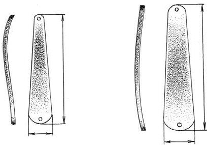 Рис. 6. Упрощенные копии скандинавских и отечественных блесен Если специалист у большинства выпускаемых приманок измерит параметры в нескольких принципиальных точках, вердикт будет однозначным – выкинуть на помойку. Конечно, новичок, не зная таких тонкостей, но, веря в свою очень красивую и явно не дешевую железку, испытывает в конце рыбалки разочарование. Вывод: при покупке блесны замер толщины профиля и ширины заготовки должен быть обязательным. Немаловажное значение для игры блесны имеет правильный загиб или радиус кривизны, который определяется с помощью линейки, лекала, микрометра или штангенциркуля. Если замер параметров невозможен, то визуальную оценку блесны проводят на ровной поверхности, просмотрев нет ли завалов на бок, или вперед и назад от предполагаемого центра тяжести. Центр тяжести определяют, установив блесну на ребро линейки, ладони, карандаша и т. д. Если блесна заваливается на бок, то скорее всего, рыбу она вряд ли заинтересует.