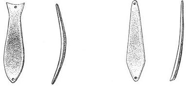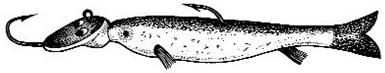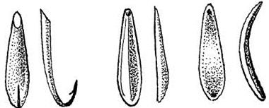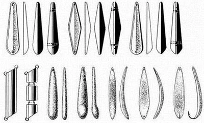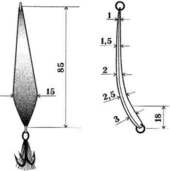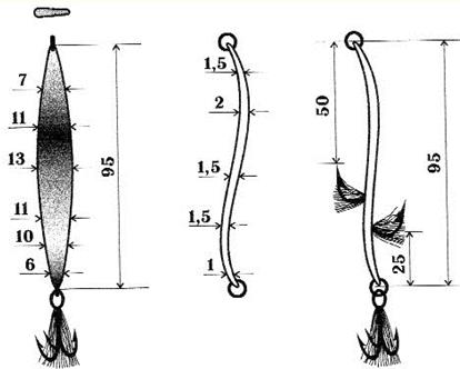 Рис. 7. Щучья блесна После замера сравните полученные данные с неоднократно проверенной моделью, хоть отдаленно напоминающей по конструкции и форме вашу блесну (рис. 7). Если хотите – это классика блесен. Сравните эту блесну с центральной на рис. 6 и вам все станет понятно (дополнительный изгиб по длине лишь прием для отвода глаз неискушенного рыболова). Многие блесны изобилуют многочисленными недостатками, точнее недоработками: 1. шероховатость поверхности; Большинство недостатков устраняется в ходе слесарной обработки или с помощью заливки необходимого количества расплавленного металла. Недостатки устраняются легко, если знаешь, в чем они выражаются и как их устранить. Во всех случаях рыболов должен опираться на существующие аналоги правильно изготовленных (уловистых) блесен, качество которых проверено временем (рис. 8).