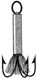 Рис. 12. Оформление и маскировка тройника с помощью кембрика красного или оранжевого цвета и синтетических волокон Если клев слабый, то при отсутствии тройника рыболов ощущает многочисленные потычки рыбы, но подсечь ее, как правило, не удается. Так как ловля окуня происходит на глубинах редко превышающих 3–5 метров, то у многих блесен давно найдено разумное сочетание размера, веса и игры (рис. 13). Если отбросить нюансы, то игра большинства окуневых блесен однотипна.
