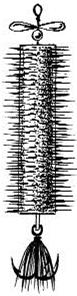 Рис.10 Вариант приманки «вертолет» Окуневые блесныОкунь самый агрессивный, бесстрашный и, в то же время любопытный хищник наших вод. С судаком его роднит не только то, что они представители семейства окуневых, но и схожая манера поведения – жадность и прямолинейность. Принцип ловли одинаков: обнаружение стаи на большом пространстве водоема и ее быстром вылавливании. Основные требования к блесне: при минимальной игре быстро дойти до горизонта ловли. Большинство окуневых блесен привлекает хищника при разных темпах игры. Даже с одной уловистой приманкой поймать рыбу удается независимо от времени и сезона ловли. Хотя давно известно, что на разных водоемах окунь предпочитает блесну определенной формы с различными нюансами игры (рис. 11). На водоемах Подмосковья окунь предпочитает узкие вытянутые блесны (рис. 11 а, б). В озерах Тверской области – лучше реагирует на достаточно широкие планирующие приманки (рис. 11 в). Рис. 11. Наиболее типичные окуневые блесны: а) «луч»; б) «малек»; в) «карасик» В большинстве рек окунь предпочитает объемные или даже цилиндрические приманки (трубчатые). Времена, когда в окуневой блесне ценилась возможность при бешеном клеве из одной лунки вытащить максимальное количество рыбы, и с этой целью спиливалась бороздка крючка или вместо него устанавливалась загнутая иголка – давно прошли. Часто окунь реагирует не на саму блесну, а на плавно раскачивающийся тройник, обрамленный пучком красных или оранжевых синтетических ниток (хуже шерстяных), или на замаскированный подобным образом крючок, висящий на цепочке или на монофильном поводке (рис. 12).