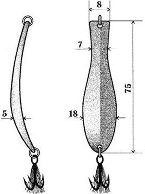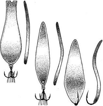 Рис. 5. Блесна с ассиметричным расположением боковых сторон по отношению к вертикальной оси Щучья блесна с учетом некоторых тонкостей в игре из всего ряда блесен больше всего подходит под определение «универсальная приманка». Умелый рыболов на такую блесну способен поймать любую рыбу. Именно поэтому блесны для ловли щуки высоко ценились и всегда были редкостью у блеснильщиков. На правильно изготовленную щучью блесну, можно поймать любую рыбу в любом водоеме, но при условии, что глубина не превышает 3–5 метров. Ловить легкой планирующей блесной на больших глубинах не рационально, так как слишком много времени уходит на погружение приманки к заданному горизонту ловли (т.е, туда, где предположительно располагается хищник). Естественно, даже в ряду однотипных блесен существует разные по весу приманки для разной глубины ловли. И в то же время излишне утяжелять блесны нерационально, так как они теряют подвижность и перестают привлекать хищницу. Естественно, блесны для ловли в стоячей воде всегда в меньшую сторону отличались своим весом от блесен для ловли на течении. Желание в одной конструкции и форме, а в конечном итоге – в игре блесны, найти фрагменты, привлекающие внимание разной рыбы, привели к явному удорожанию приманок, и как следствие, к падению спроса на них. Ситуация обострилась вследствие того, что блеснильщики – профессионалы, знающие толк в приманках, изготавливали блесны либо сами, либо приобретали на заказ. Большинству рыболовов нюансы изготовления и качество блесен были безразличны. Положение мало изменилось и в настоящее время. Стабильно продается только то, что дешевле. Токарная, фрезерная, да и слесарная обработка блесен стала применяться реже и была низкого качества. То же можно сказать и о штампованных моделях. Редко выдерживались и заданные размеры приманок. Заливка форм стала проводиться кое-как, без последующей доработки. Даже кустарям-одиночкам изготавливать на продажу блесны, выполненные по конкретному чертежу и заданной технологии, стало невыгодно – их мало кто мог оценить. Хорошие блесны, естественно, стоят намного дороже внешне привлекательного ширпотреба, непригодного для ловли. К тому же количество хищной рыбы вблизи крупных городов сократилось настолько, что блеснить ее стало нерационально, да к тому же и некому, так как многие мастера отвесного блеснения ловить рыбу со льда перестали. Хотя для настоящего блеснильщика – это не аргументы, да и денег на уловистую приманку не жалко. Вопрос в том, где ее найти? Несмотря на то, что в настоящее время положение выровнялось и рыбу со льда блеснят миллионы рыболовов-любителей, для которых цена – это не вопрос, хорошую блесну приобрести так же сложно, как и 15 лет тому назад. Большинство зимних блесен по-прежнему упрощенная копия изначального аналога. Сейчас даже большинство известных типовых моделей примелькавшихся блесен изготавливают по упрощенной технологической схеме – так проще и дешевле (рис. 6).