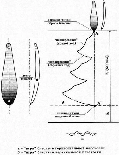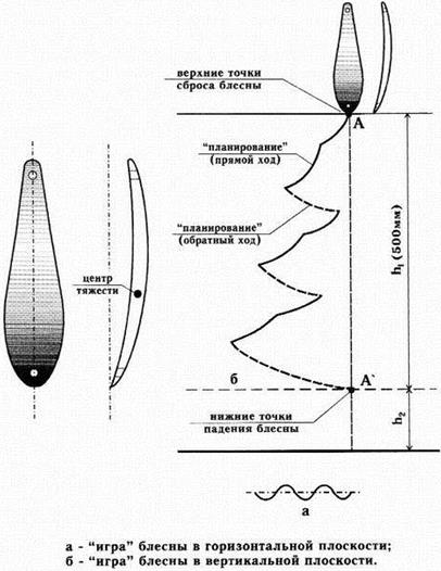 б) Рис. 2. Зимние блесны: а) уловистые с правильно выбранной геометрией профиля; б) ограниченного применения При этом не имеют значения материал и технология изготовления приманки (заливалась ли форма свинцом, баббитом, была ли выполнена из цельной металлической заготовки (пластины), спаяна или склеена из двух половинок). Главное, чтобы ее размеры были пропорциональными, точными, соответствовали логике конструирования (аэродинамика, гидравлика) и были проверены на практике. Наибольшие сложности возникали при изготовлении блесен для ловли щуки. Судаковые приманки, как правило, обладают приличным весом, что несколько скрадывает (нивелирует) неточность размеров. Щука, в отличие от других рыб, с подозрением относится к металлическим приманкам без должной фазы планирования. Чаще она соблазняется блесной плавно скользящей в толще воды за счет дополнительной ширины, легкости и сложного профиля (рис. 3). Рис. 3. Универсальные планирующие блесны У отдельных блесен для ловли хищницы за счет геометрии профиля и смещенного центра тяжести, создается дополнительная подвижность или обратный ход, которые являются отменным раздражителями (рис. 4). Рис. 4. Перемещение блесны со смещенным центром тяжести (обратным ходом) Щучья приманка как бы мельтешит перед носом у хищника, напоминая назойливую мелочевку. Отличительная особенность многих уловистых приманок – незначительная асимметричность боковых сторон по отношению к вертикальной оси (см. рис. 1, рис. 5). Они не замирают сразу после достижения нижней точки сброса, как большинство блесен, а еще некоторое время импульсивно двигаются толчками, имитируя раненную, выбивающуюся из сил рыбку. Асимметричные блесны не заменимы как по первому и последнему льду, так и в глухозимье при ловле хищной рыбы в замкнутых водоемах и реках со слабым течением. Активный хищник атакует приманку во время планирования, пассивный – при перемещении в нижней точке.